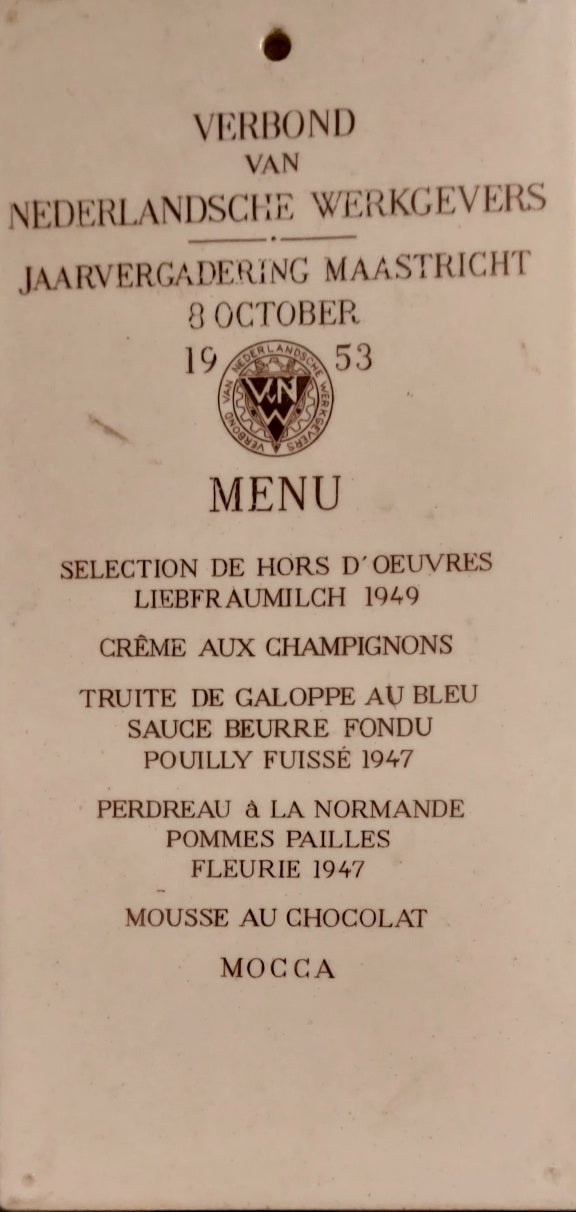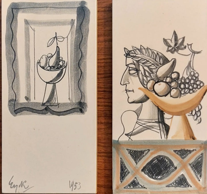 Twee beschilderde tegels met op de achterzijde een menu. Eyck ontwierp en beschilderde, in opdracht van het Verbond voor Nederlandse Werkgevers, 15 verschillende tegels met op de achterzijde een menu. Een van de tegels ondertekende en gedateerde Eyck 1953. Verblijfplaats van de resterende tegels onbekend. De hier aangeboden tegels komen uit de collectie Houtzager, voormalig directeur van het Centraal Museum Utrecht. GERESERVEERD.
