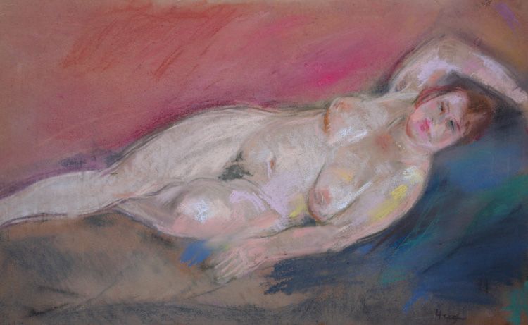 Pasteltekening, gesigneerd rechts onder. ‘Liggend naakt’ Afmetingen: 31,5 cm x 46,5 cm. Lijst: