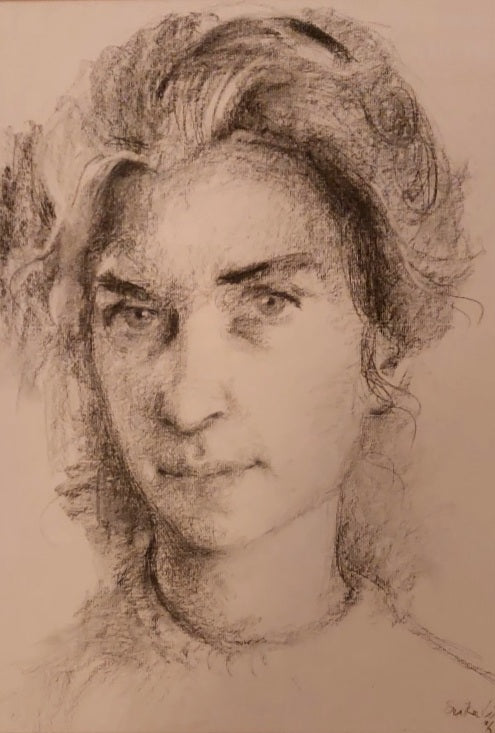 Houtskooltekening op papier, gesigneerd en gedateerd '64 rechts onder. Portret van Anke Bouma Scholten. Afmetingen: 45 cm x 35 cm.