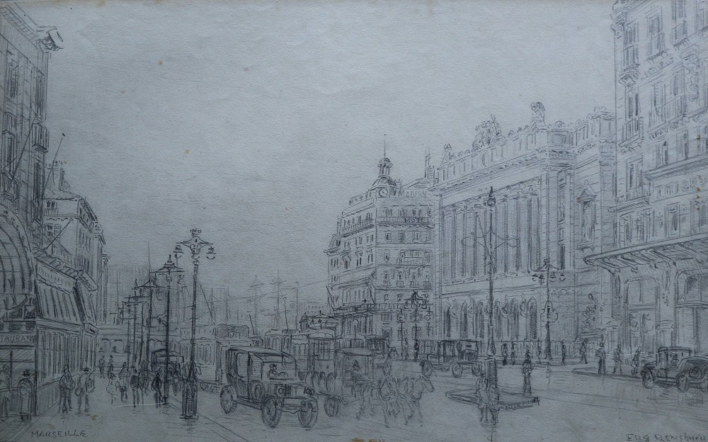 Potloodtekening, gesigneerd en gedateerd 1928, rechts onder. "Centrum Marseille"