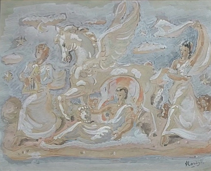Aquarel, gesigneerd rechts onder. 'Pegasus met drie godinnen' Afmetingen: 30 cm x 40 cm. Inclusief lijst: 50 cm x 60 cm.