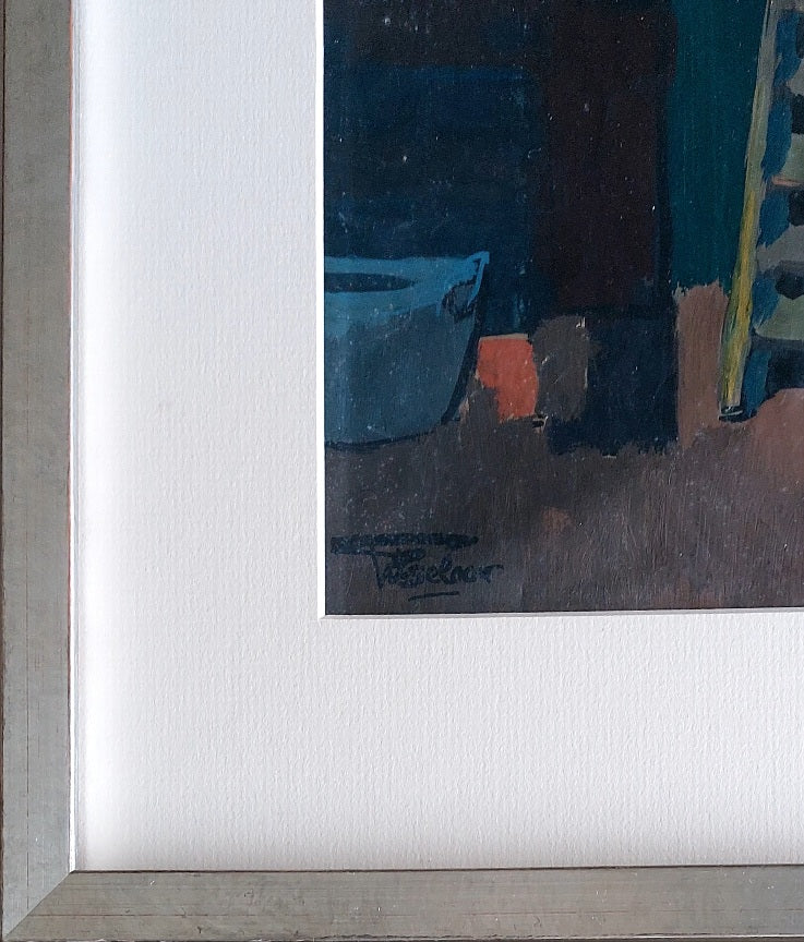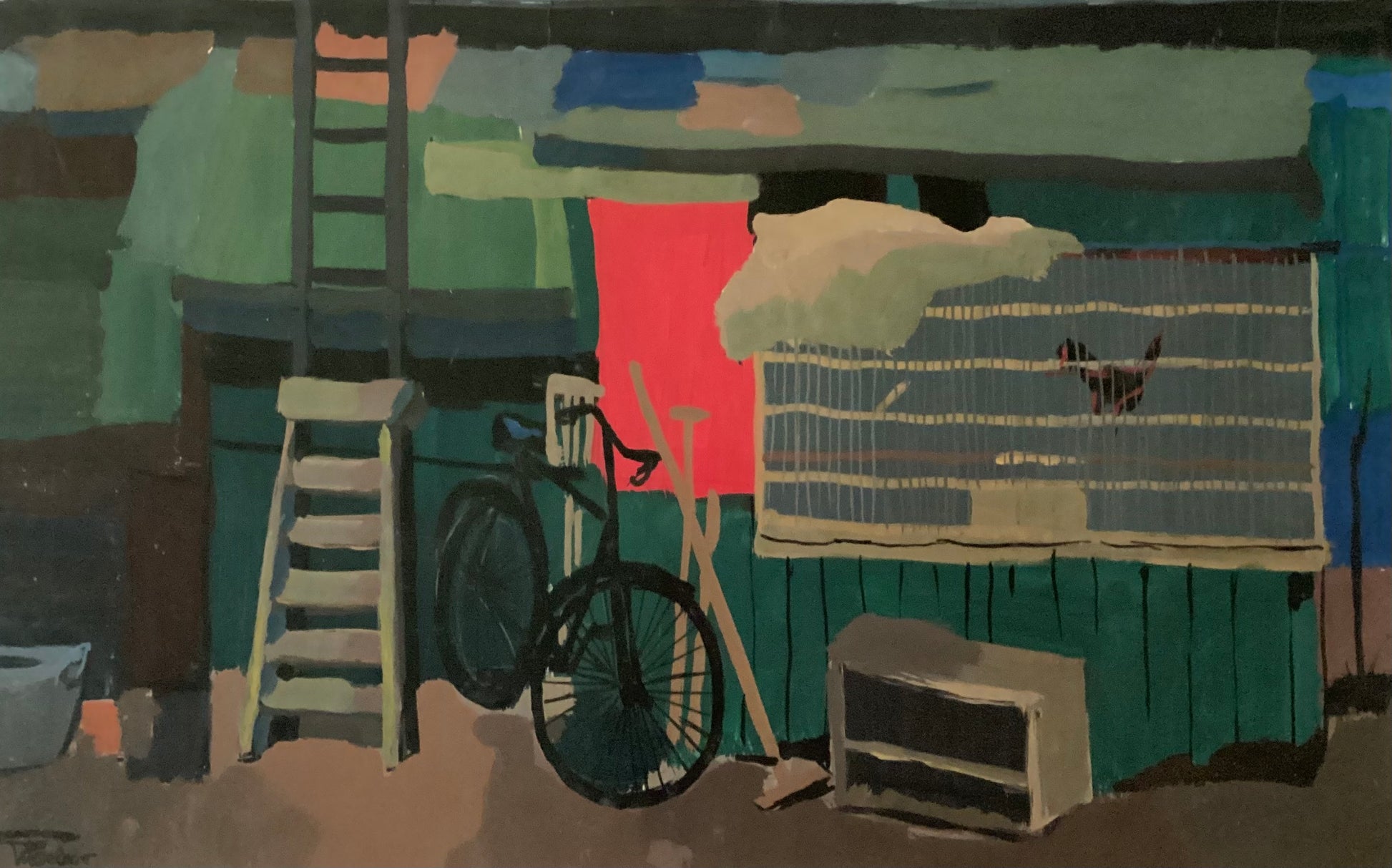 Gouache, rommelschuur met vogelkooi en oude fiets. Gesigneerd linksonder. Afmetingen: 30cm x 48 cm. Voorzien van nieuwe lijst: 45cm x 63 cm.