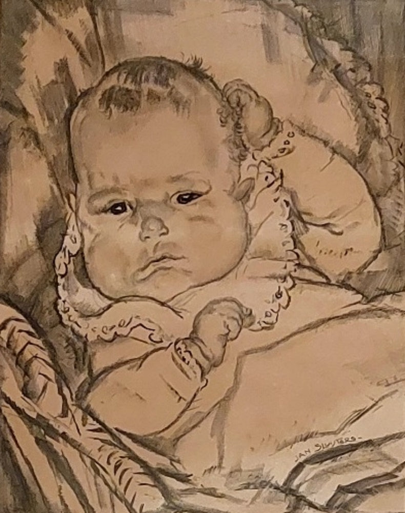 Kleurenlitho, gesigneerd in de druk. 'Portret van een baby'.