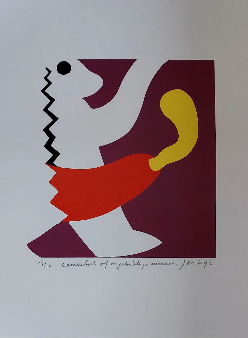 Zeefdruk, gesigneerd, genummerd 27/50 en gedateerd '92 in potlood. Titel" 'Camembert of de gelukkige minnaar'.