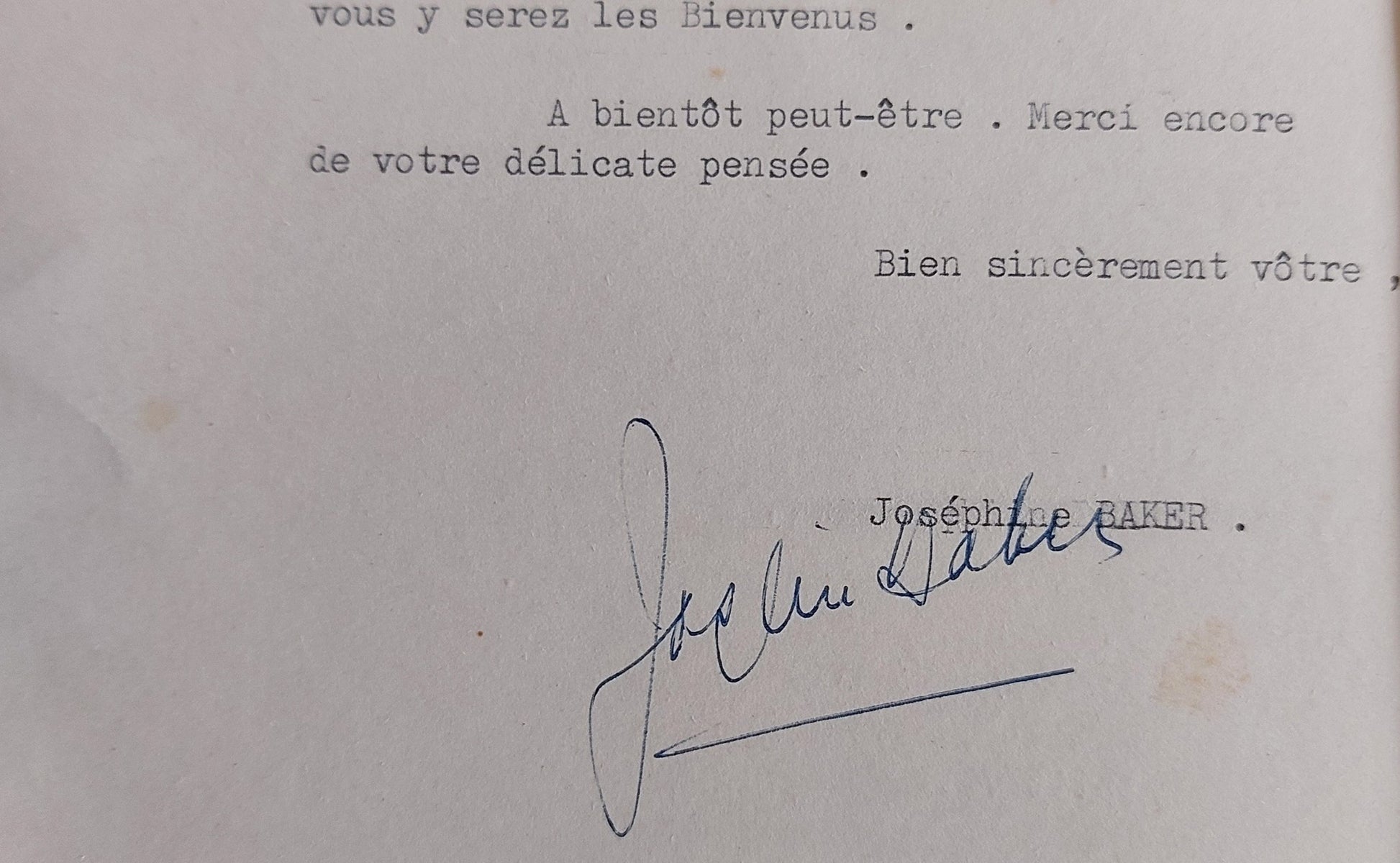 Joséphine Baker, originele handtekening compleet met enveloppe en persoonlijke noot voor de ontvanger.