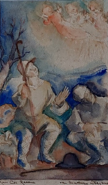 Aquarel, gesigneerd rechts onder met annotatie: aan Cor Reisma' Afmetingen: 26 cm x 16 cm. Inclusief lijst: 37 cm x 27 cm. Titel: Engelen verschijnen aan de herders.