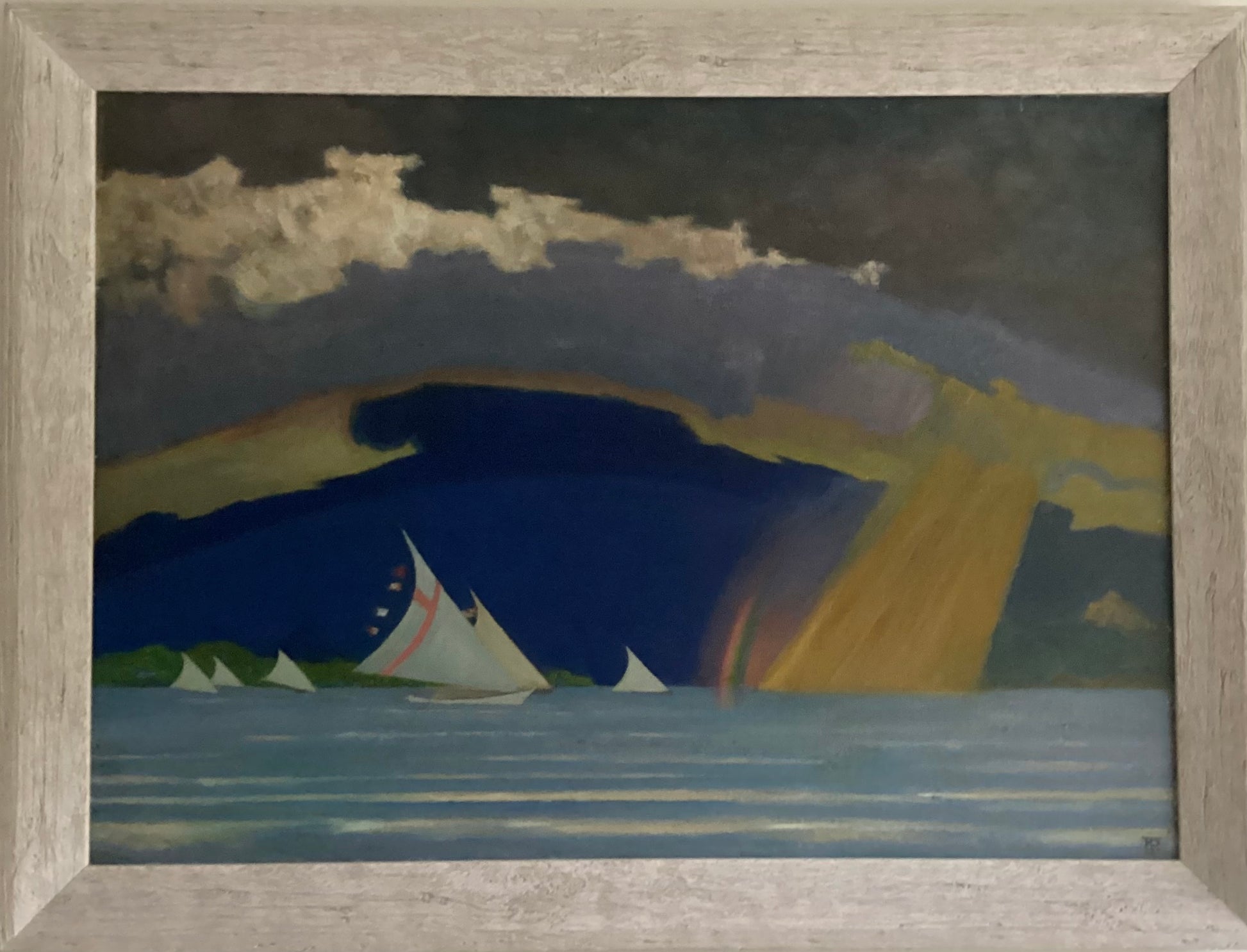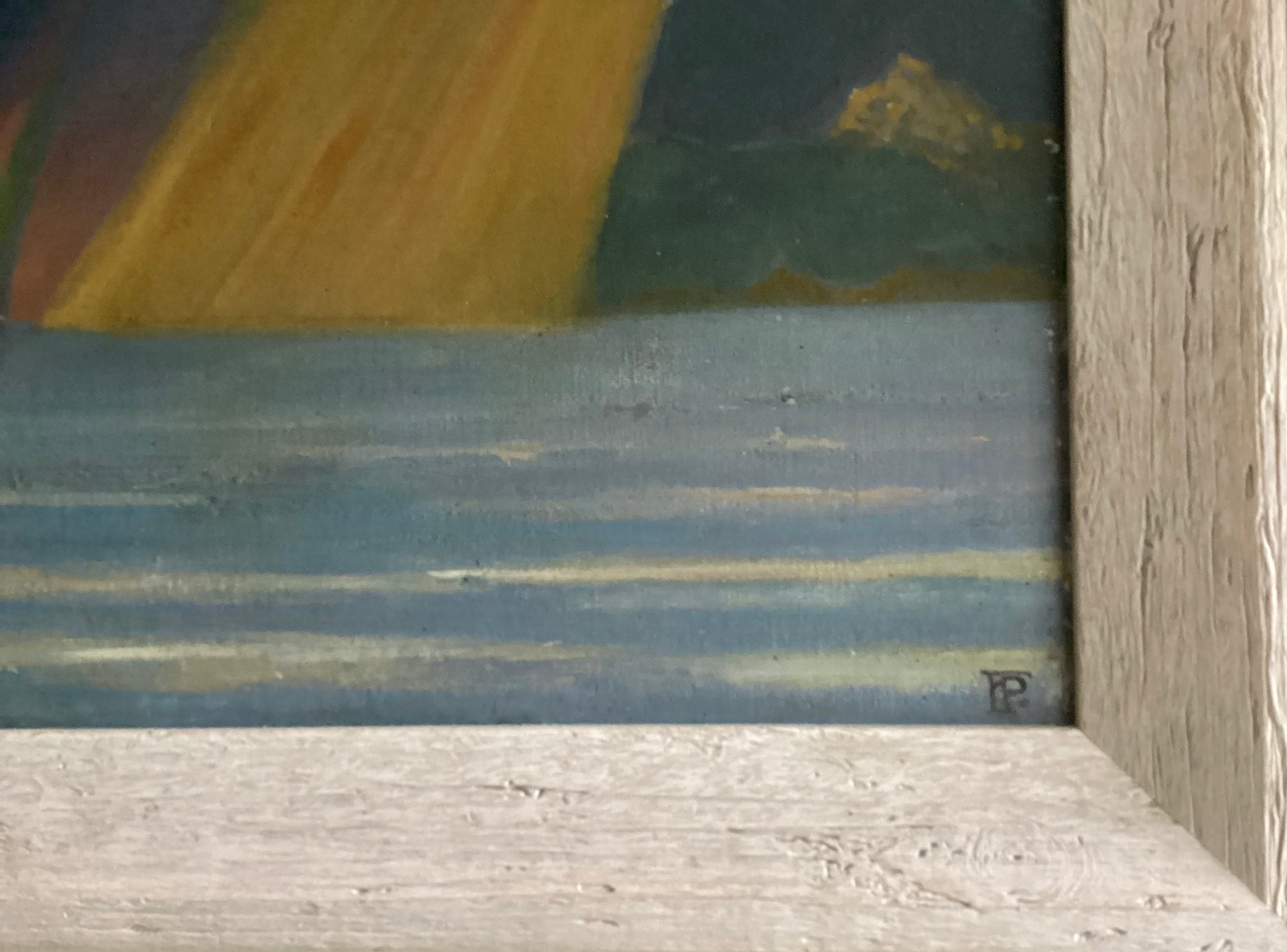 Olieverf op canvas bevestigd op paneel. 'Stormachtig weer voor de Indonesische kust' Afmetingen: 50 cm x 70 cm. Ingelijst: 60 cm x 80 cm.