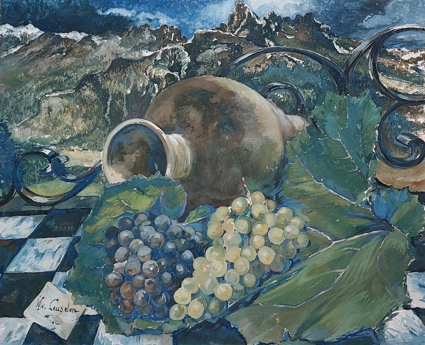 Olieverf op doek, gesigneerd links onder. 'Stilleven met druiven'.