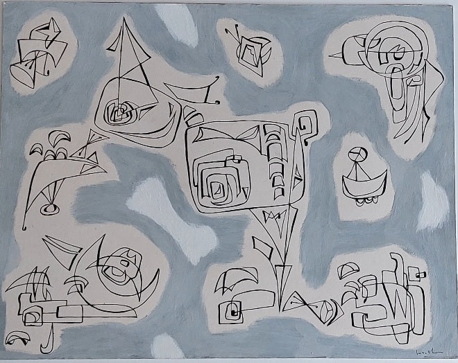 Olieverf en inkt op karton, gesigneerd rechts onder. Afmetingen: 43 cm x 55 cm. Niet ingelijst.