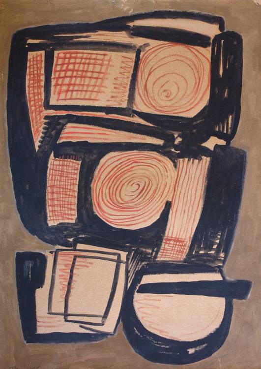 Gouache, gesigneerd links onder. Abstracte compositie Afmetingen: 80 cm x 60 cm. Niet ingelijst